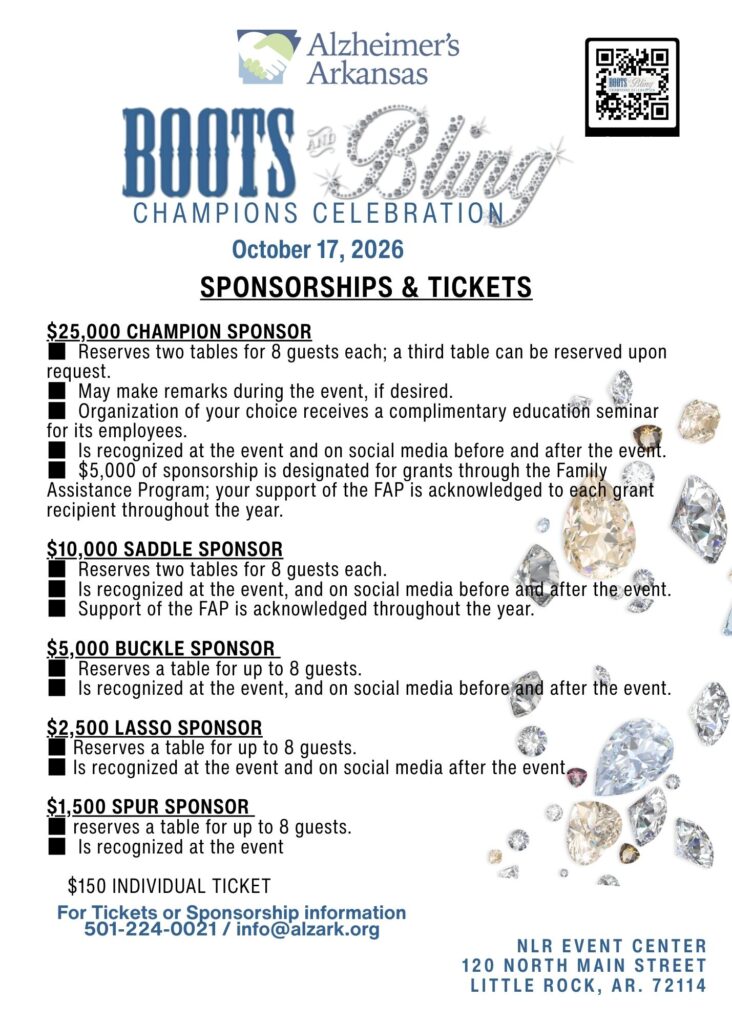 Champions Celebration is our premier, annual fundraiser for Alzheimer’s Arkansas! All proceeds raised stay right here in Arkansas to help provide free programs and services to family caregivers caring for those living at home with dementia or other chronic illnesses. The funds raised help us offer educational workshops, respite activities, financial assistance, online resources, podcasting, and so much more.