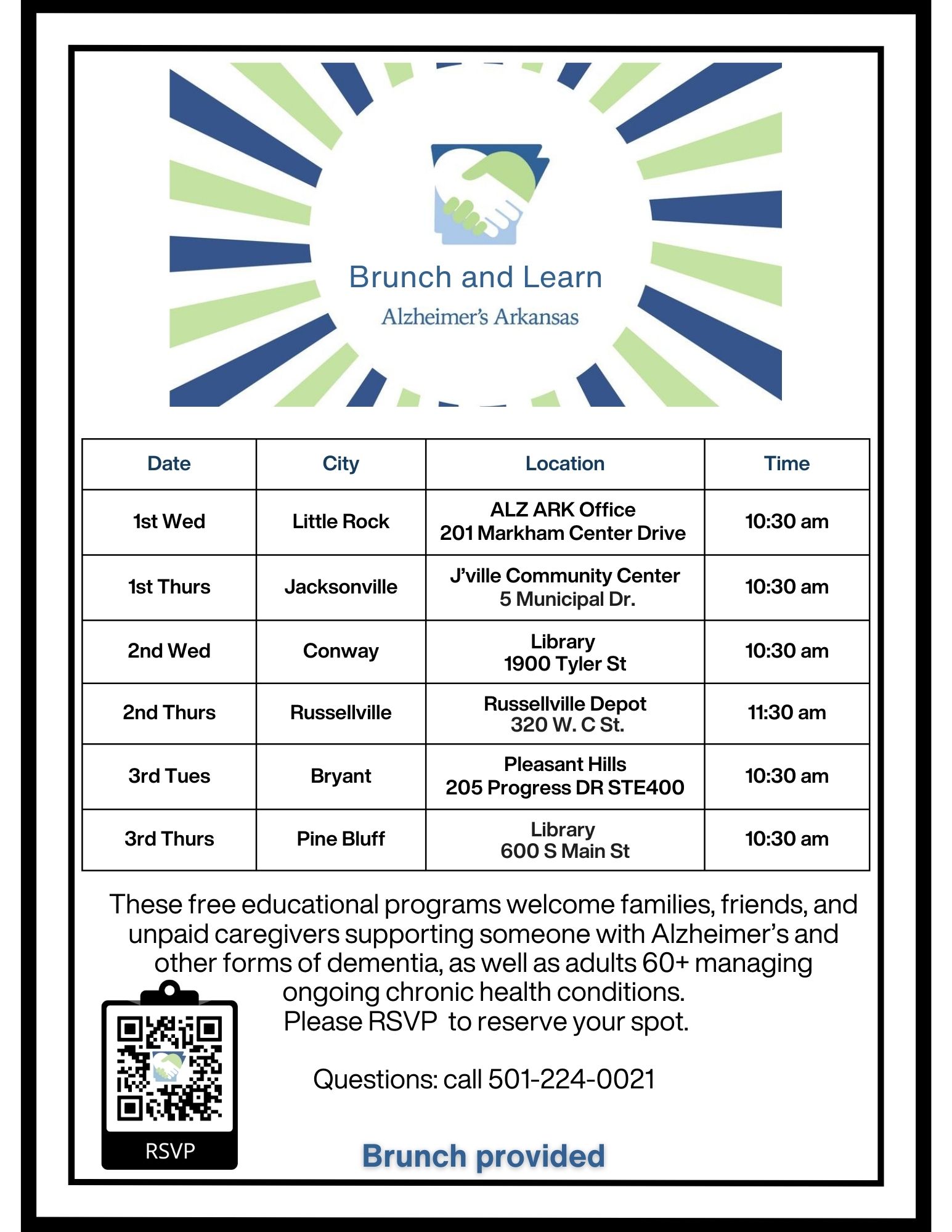 Even though these are FREE to attend, we ask that you RSVP to ensure we don’t go over capacity and that we have plenty of refreshments, seating, and supplies! Choose the month you wish to participate by clicking the link first, then put in your contact information, and city you plan to come to. If you have any problems, just give us a call 501-224-0021 or email info@alzark.org.